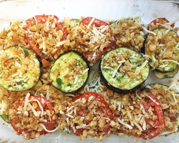 - Sprinkle breadcrumbs over all.
