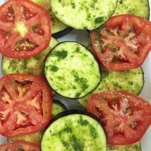 - Pour basil-oil mixture into a small bowl. Brush eggplant and tomato slices with the oil.