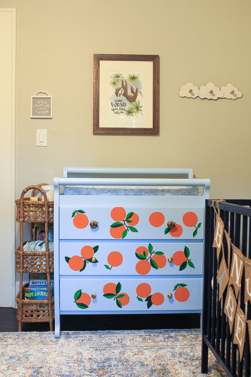 I had the crazy idea to paint oranges on the dresser we got for him. He is my Florida baby after all! I didn’t love the gray the previous owners had it, so I thought of the oranges… but then I had a vision of painting it French blue too, since the walls in our house are also gray. I’m not much of an artist but I felt like I could do a decent job since I’ve dabbled in watercolor over the past year. I had SUCH a great time out in our garage on hot nights slowly painting his sweet little dresser. It was totally not an essential task, but I loved doing something special for him. And I was actually bummed when I finished, because I missed going out there and thinking about him and working on something for him and listening to motherhood podcasts.