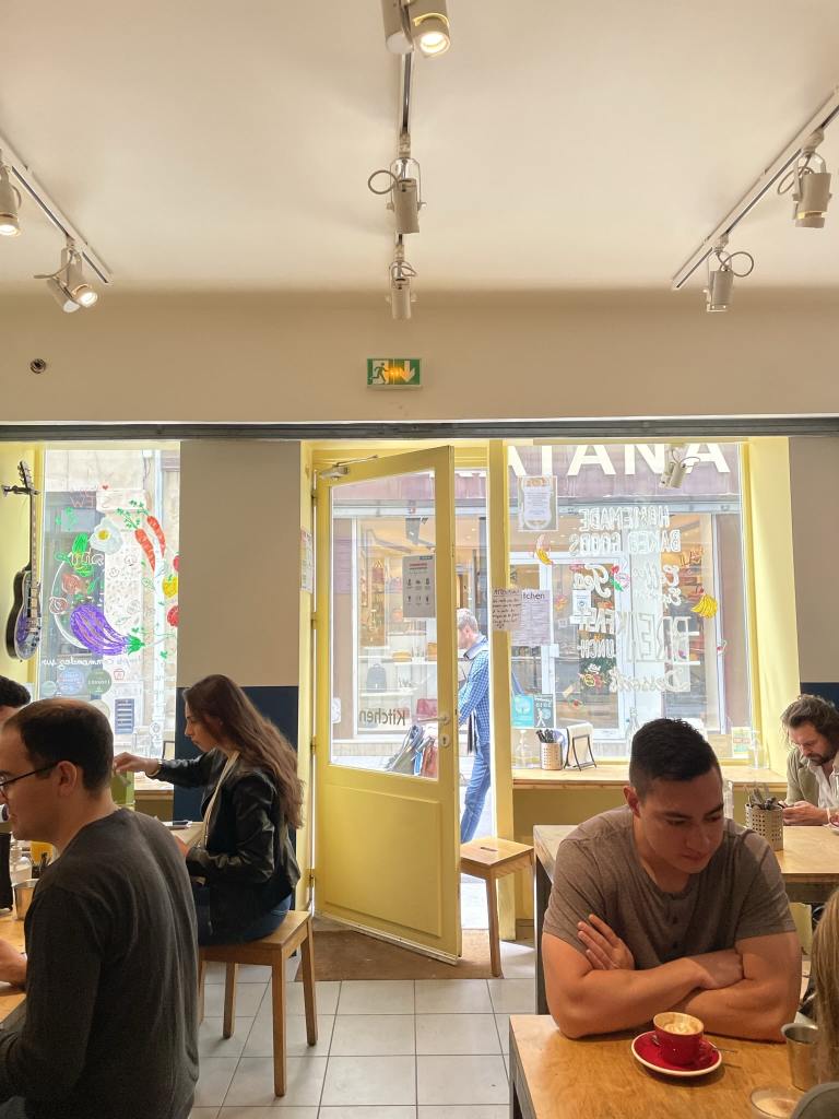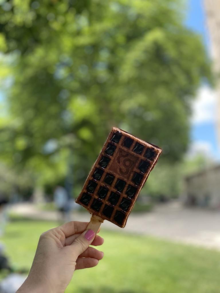 Taking the stroller and the baby down the stairs intimidated me (there was an elevator but it was so tiny, LITERALLY only one person could fit – not even our very small stroller that fit in the airplane aisles!), so I strapped Arthur in the baby carrier and walked to a place that sells gluten-free waffles.