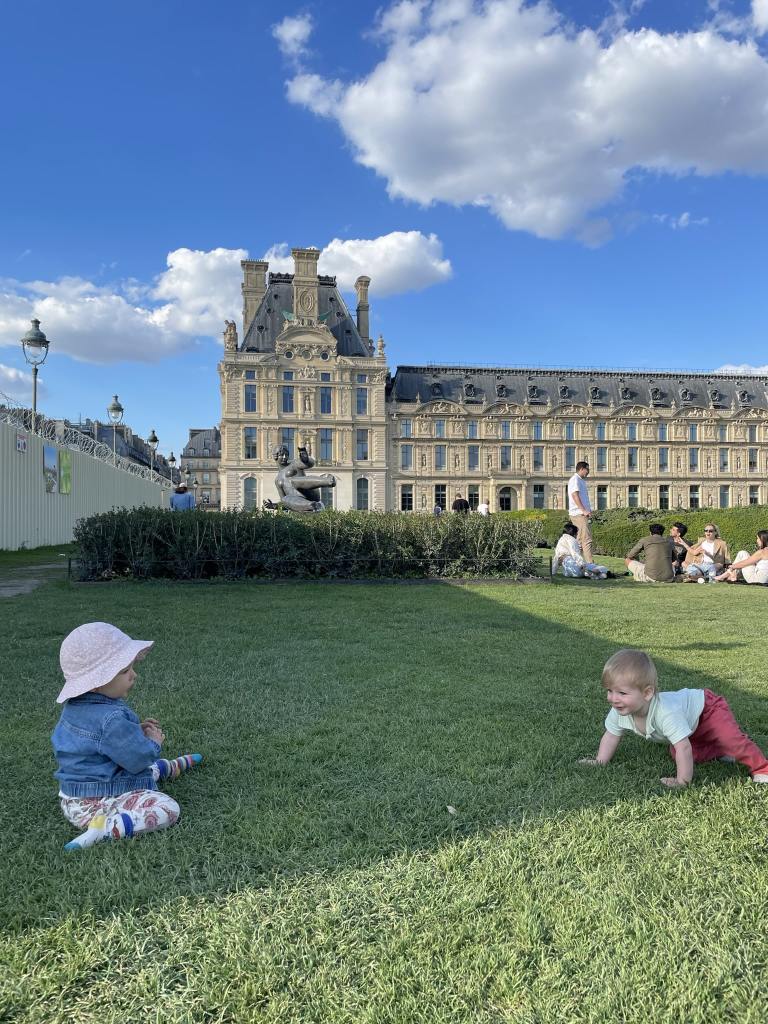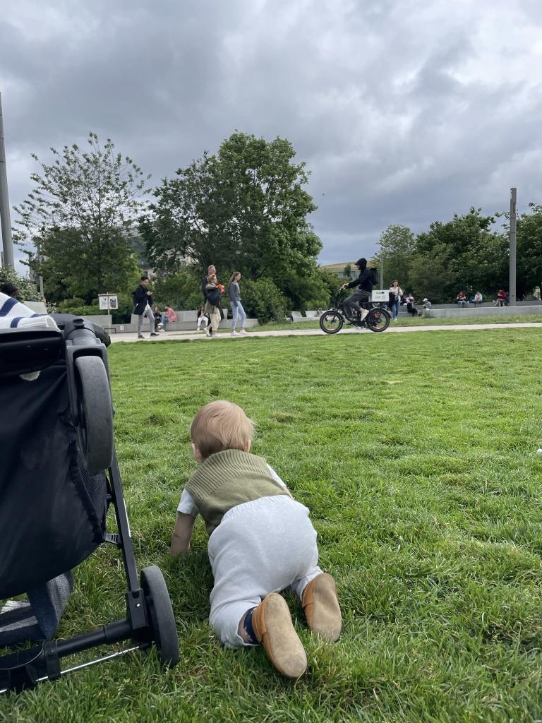 It was CROWDED walking down Rue Rivoli. The Champion’s League finale was happening later that night, and there was a huge crowd of fans gathered at Hotel de Ville. I quickly scanned the map and we ended up just a few blocks over at a park I didn’t know existed under Tour Jean-Sans-Peur. It was a beautiful, sunny day and the park was spotted with people lounging, eating, and resting. There was a nice playground area with rubber flooring (a rarity in Paris!) and benches for parents, but the grass was perfect for my not-yet-one-year-old.
