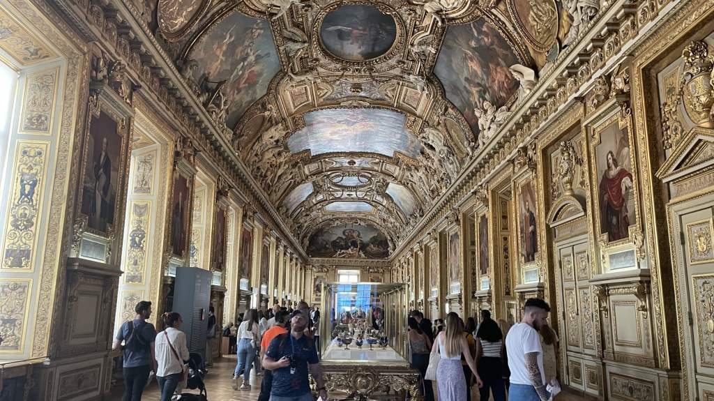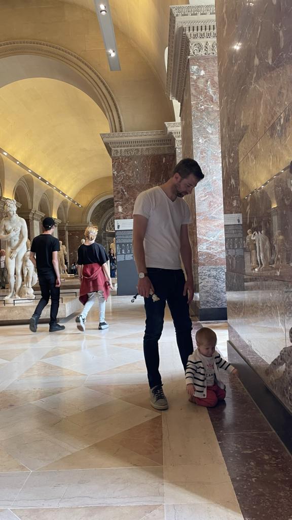 We chose Denon wing, on the right as you walk in, which is the one I would recommend if you only have a short time. It starts off with two symmetrical rooms full of light and statues, which checked the box for me of being in a beautiful room filled with art. Then you down and up a magnificent staircase showcasing Winged Victory. Off to the right, you can find La Jaconde (the Mona Lisa, as she’s known in French). As much as I thought it would be fun to take Arthur just so he could tell people, as soon as he learns to talk, that he’s seen the Mona Lisa, we decided to avoid the crowds. Haha. We went straight ahead to see the Crown Jewels.
