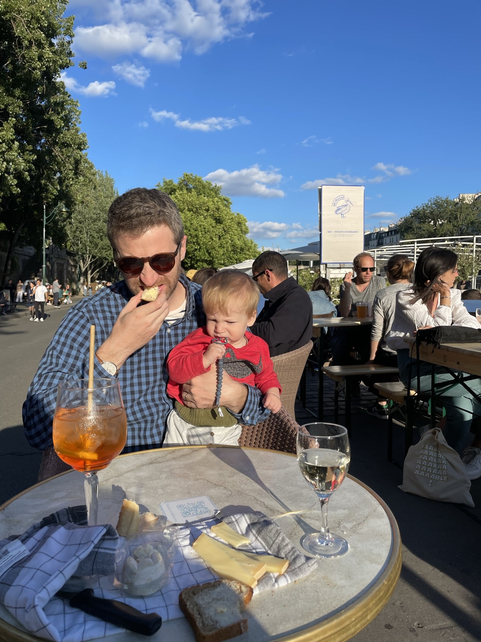 Back at the Seine, this time with better lighting (reflections on the water and colorful sunsets are key!!), a jazz band was scheduled to play on a boat along the water’s edge. I had scouted this as a perfect way for us to hear live jazz but in a setting suitable to bring a baby that might not sit quietly in a jazz lounge.