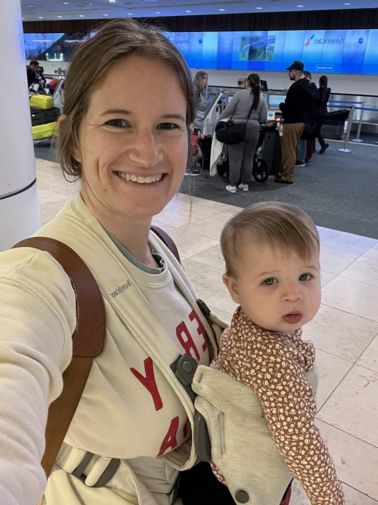 Note: We always use a baby carrier at some point in the airport, and stow it away in the bottom of the stroller when it’s not in use. Also, sometimes I will wear a fanny pack or a small crossbody in addition to the baby carrier and/or diaper bag just so I can have my phone, ID, and tickets at the ready.