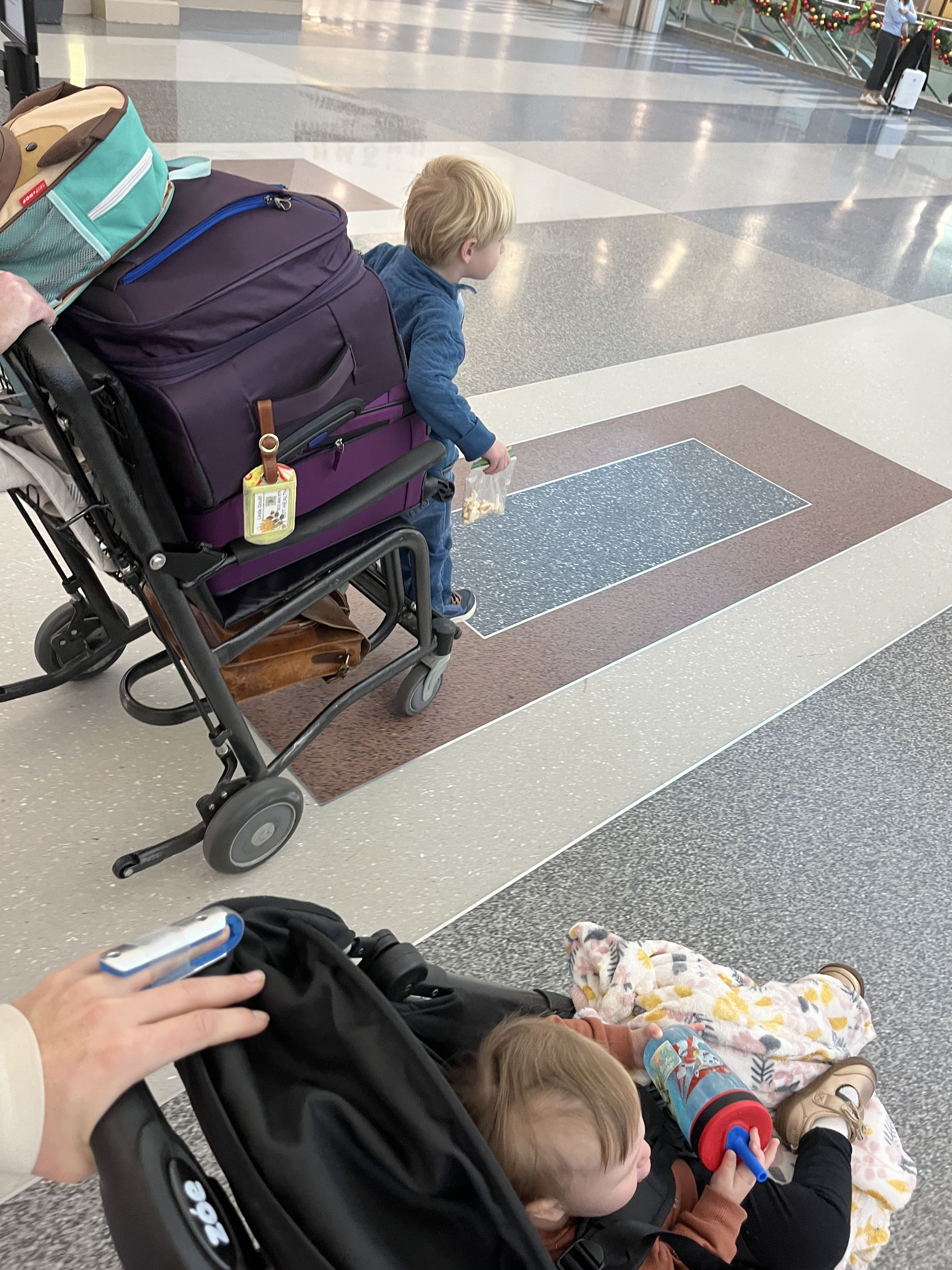 Specifics. Figure out how many THINGS (giant or small) you’re going to be toting through the airport. This is the hardest segment of your trip (most likely). Traveling ain’t for the faint of heart. Think about your setup and make sure you can physically manage it all. (Sometimes you can’t, and that’s where there are people all over the airport looking out for you! Look around and ask an agent or a family or nice looking person for help.) Gate checking is free and nice, but only if you don’t have a ton of carry-ons and personal items. Here are a couple scenarios that have worked for us: